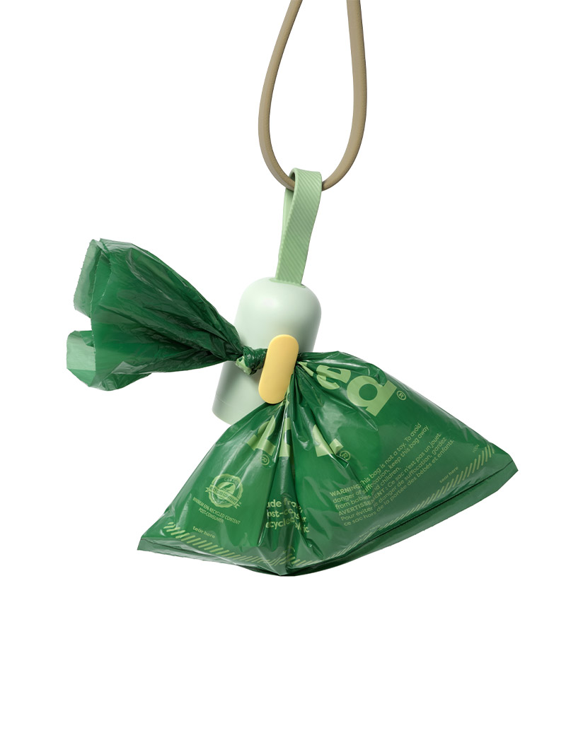 Innehåller praktisk hållare gjord i miljövänligare plast samt en rulle påsar.