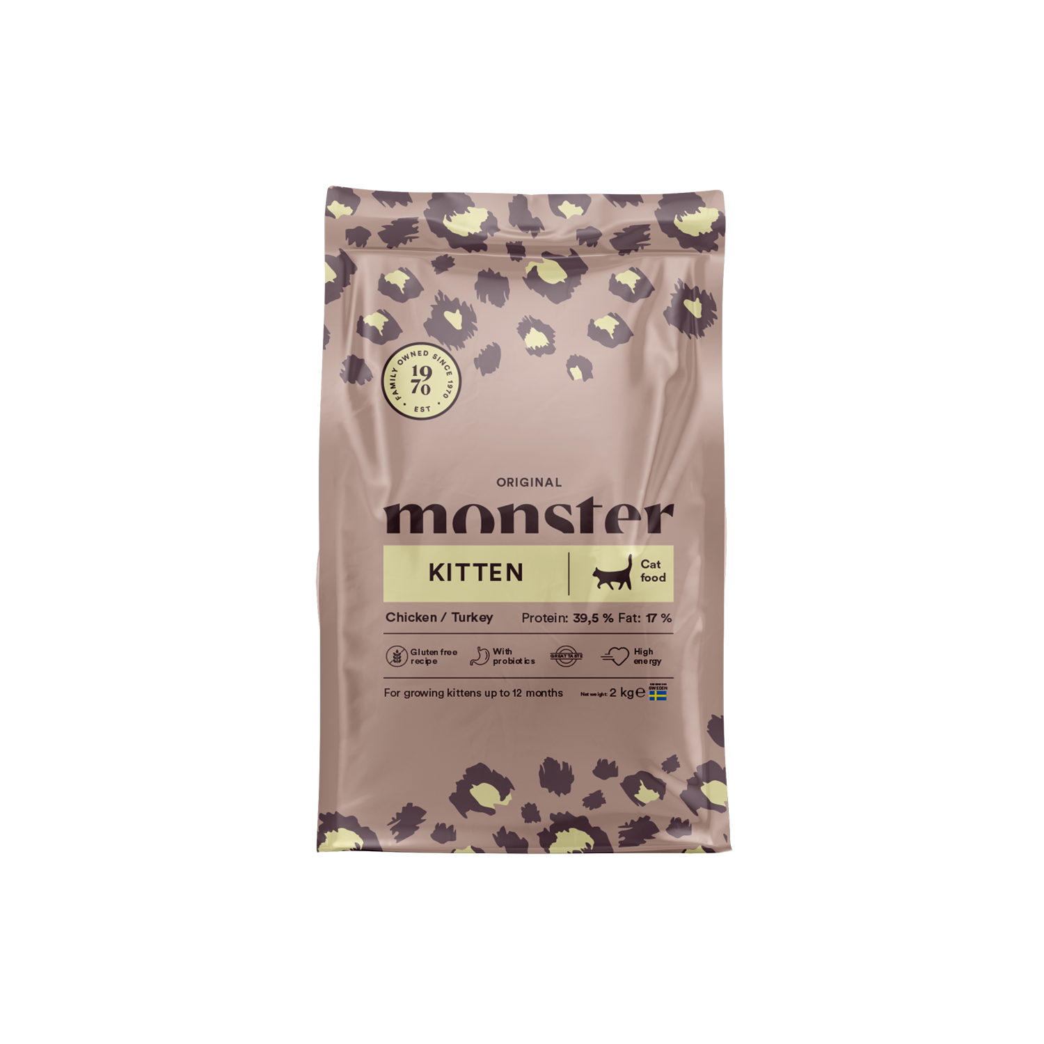 Monster Cat Original Kitten Chicken & Turkey är ett smakrikt foder som är särskilt utformat för att möta näringsbehoven hos växande kattungar.