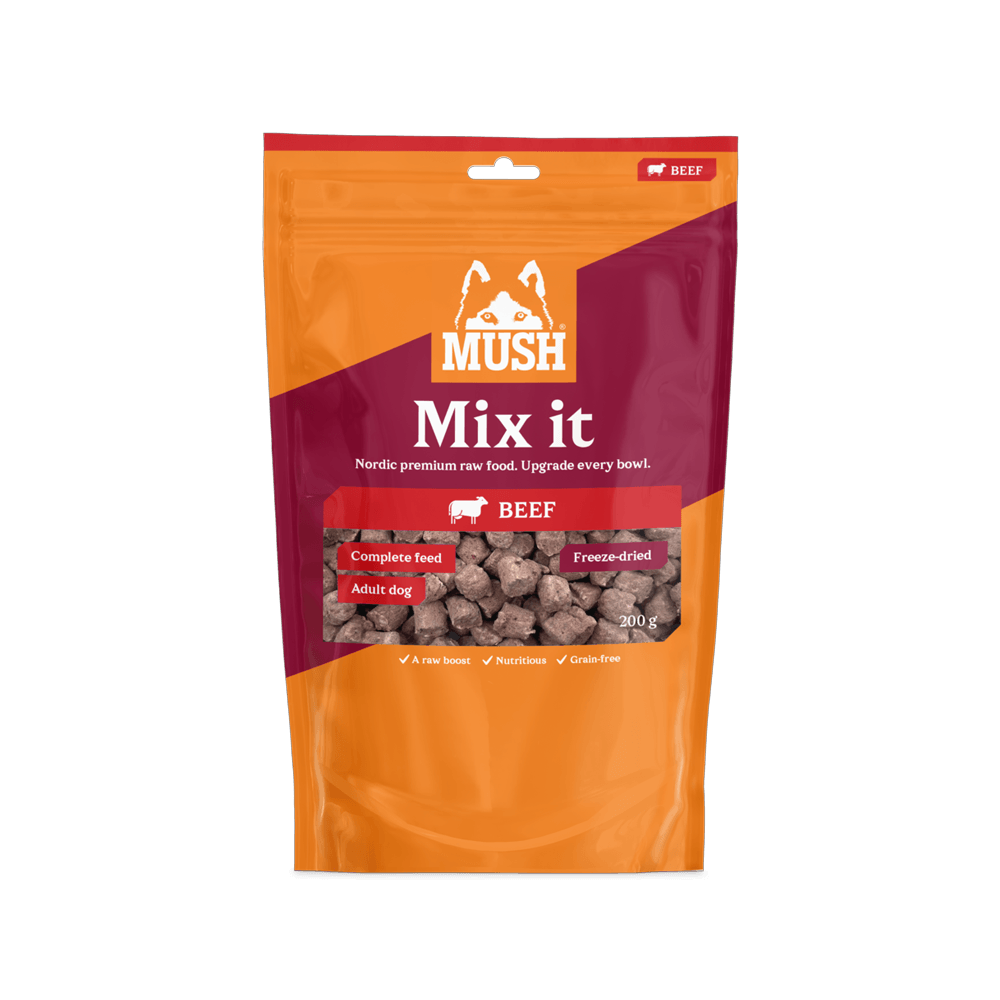 MUSH Mix it Freeze Dried-Nöt är ett lätt och smidigt sätt att tillsätta råfoder i hundens mat – var som helst. Frystorkning bevarar råvarornas näringsämnen och smak utan tillsatser.