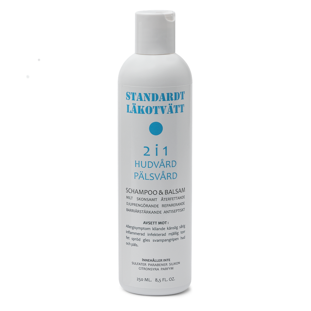 STANDARDT LÄKOTVÄTT 2 i 1 är ett återfettande klorhexidin schampo som skyddar och vårdar känslig hud och päls. Till de individer som har behov av enskilda eller återkommande behandlingar. Kan användas både i förebyggande och i eftervårdssyften. Motverkar även uttorkning av hud och päls vid upprepande behandlingar.