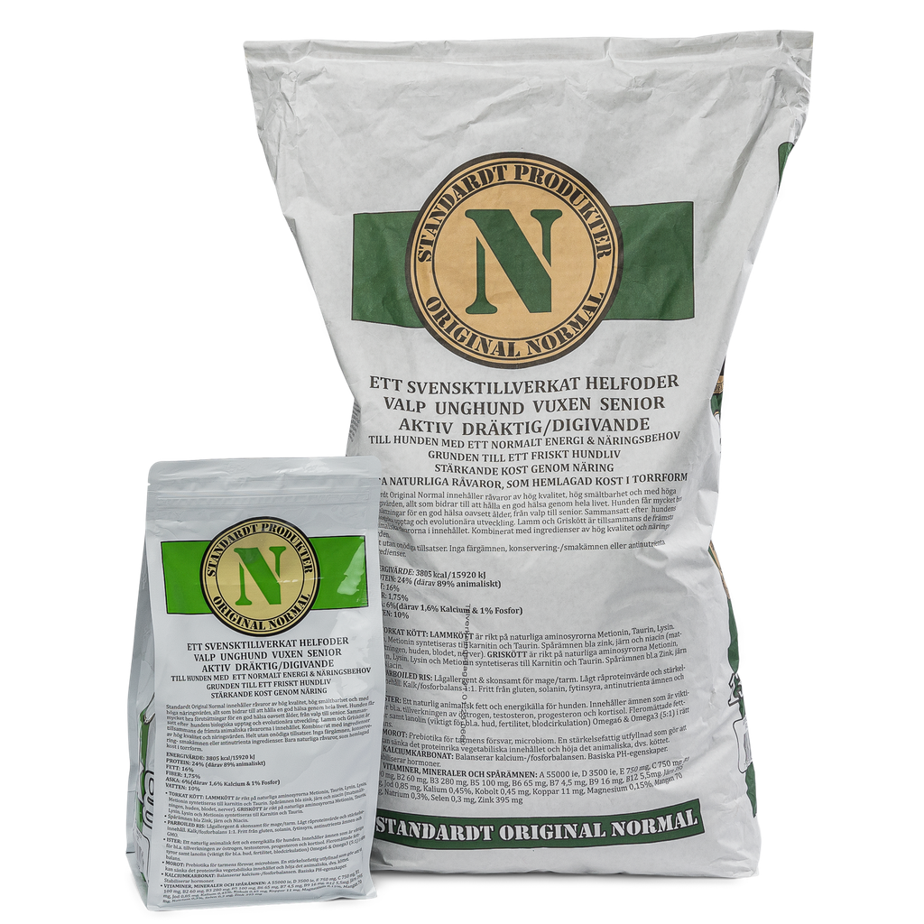 Standardts Normal hundfoder är sammansatt med ett recept som består av en hög andel animaliskt protein (minst 89% av proteinet i maten är animaliskt) och är tillverkat i Sverige och med så stor del svenska råvaror som möjligt. Standardt Normal finns tillgänglig i två förpackningsstorlekar om 2 & 13 kg.